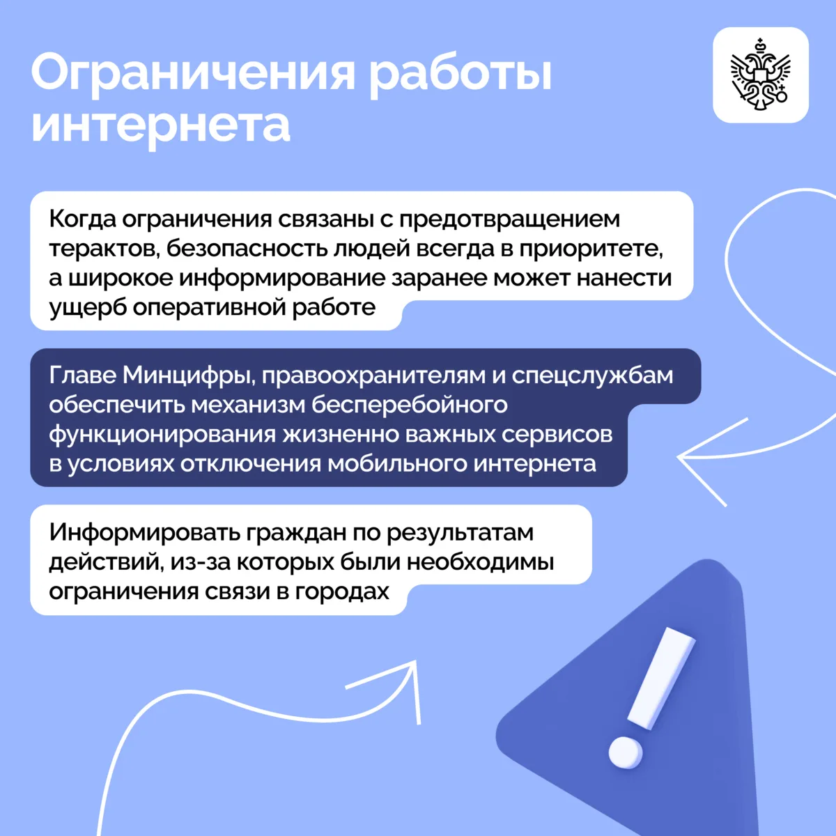 Основной темой обсуждения стало развитие Арктической зоны России и Трансарктического транспортного коридора. Участники также рассмотрели вопросы оказания бесплатной юридической помощи гражданам, обеспечения интернетом малых населенных пунктов от 100 до 1 000 жителей и ограничения работы мобильного интернета в связи с угрозой атак БПЛА в крупных городах страны.