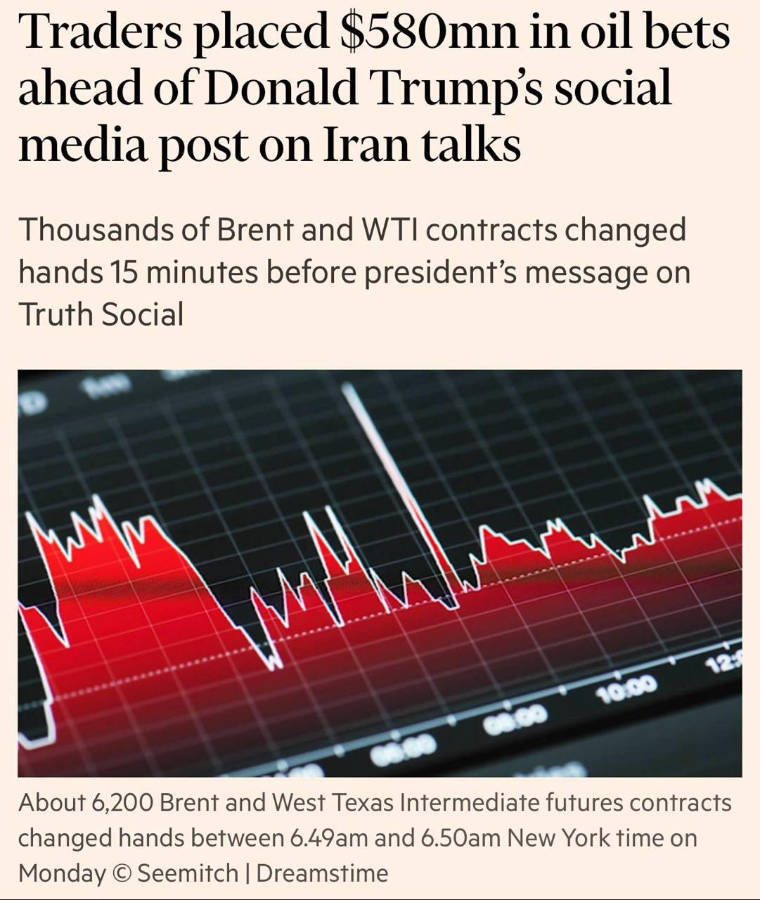 23 марта примерно за 15 минут до его поста в Truth Social на нефтяном рынке произошла странная активность. С 06:49 до 06:50 по нью-йоркскому времени трейдеры заключили около 6200 сделок с фьючерсами на нефть Brent crude oil и West Texas Intermediate – на общую сумму примерно 580 млн долларов.