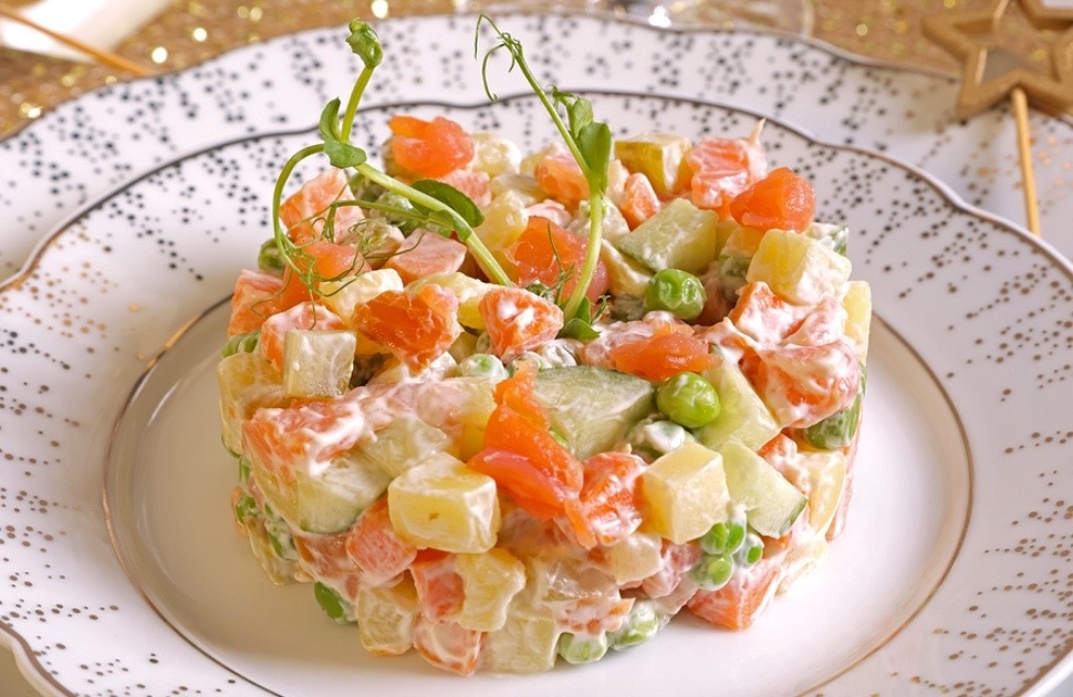 - Салат с томленой севрюгой: Альтернатива классическому оливье с неожиданными нотами вкусного бульона.