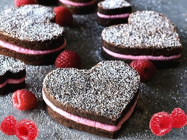 Когда основа остынет, вырежьте из брауни сердечки с помощью формочек. На каждое сердечко нанесите малиновый крем и соедините, образуя своеобразный «сэндвич». Посыпьте сахарной пудрой для завершения образа.