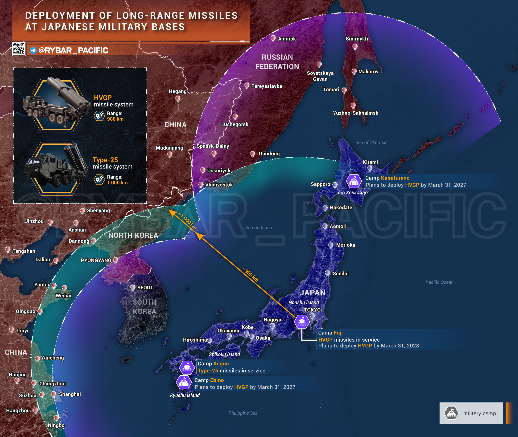 Силы самообороны на базе Кэнгун в префектуре Кумамото развернули новые ракетные системы Type-25 — модернизированные Type-12 с дальностью порядка 1000 км. Радиус поражения покрывает юго-запад Японии и побережье Китая.