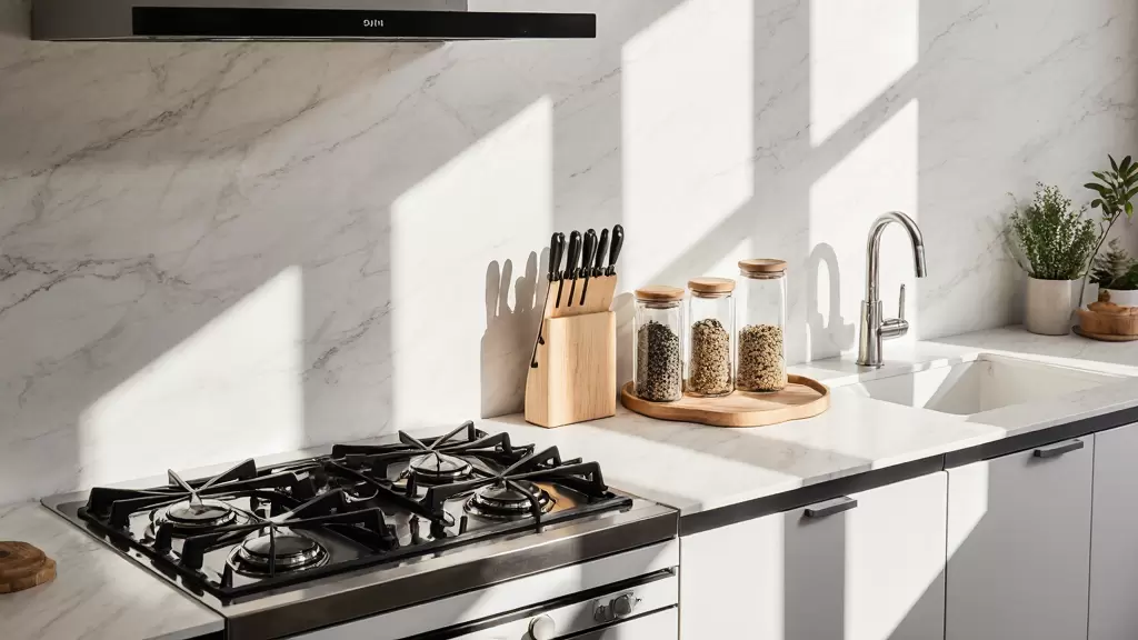 Важно хранить под рукой лишь те вещи, которые используются ежедневно. На столешнице стоит разместить качественный нож, разделочную доску, несколько лопаток и ложек. Для удобства использование рекомендуется хранить их на специальных подставках или рейлингах рядом с плитой. Специи, которые вы используете чаще всего, можно поместить в поворотную подставку, чтобы быстро находить нужную баночку среди множества остальных.