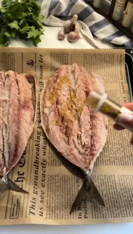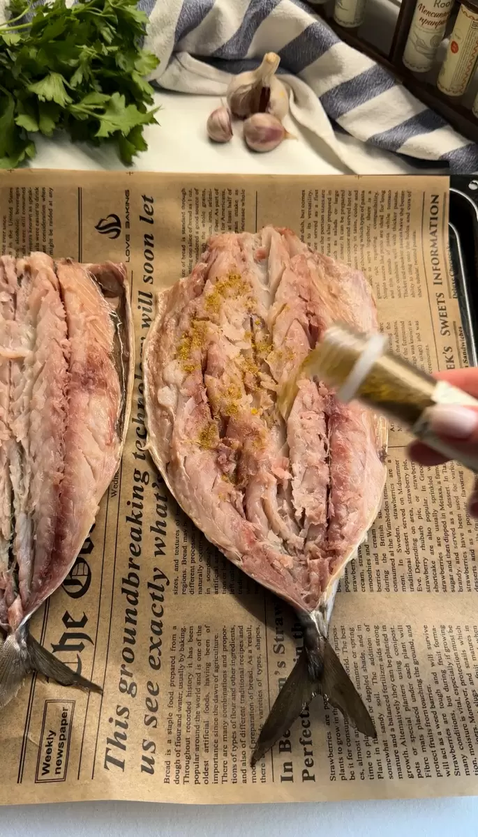 Итак, первое, что нужно сделать — подготовить рыбу: разделать ее и обсыпать специями. На следующем этапе смешайте сметану с натертым копченым сыром и равномерно распределите начинку по скумбрии.