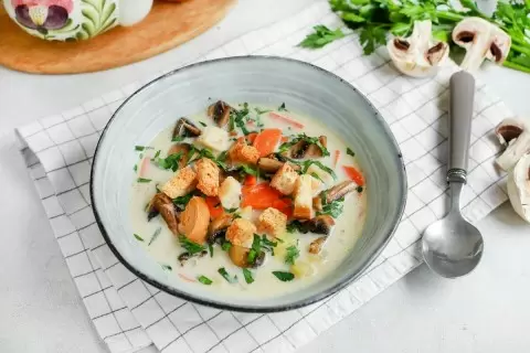 Шаг 3: Переложите обжаренные курицу с морковью в бульон. Разомните картофель в бульоне и варите всё вместе на среднем огне в течение 10-15 минут. Затем нарежьте шампиньоны и обжарьте их на сковороде. В конце приготовления добавьте в суп плавленый сыр, тщательно перемешивая до его растворения. В завершение положите обжаренные грибы и порубленную петрушку. Подавайте суп, украсив его сухариками и свежей зеленью.