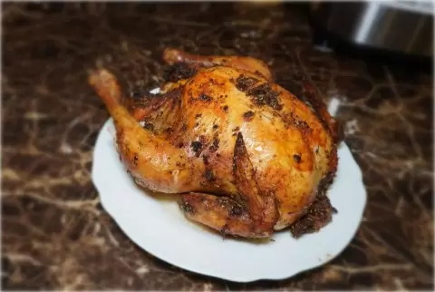 Тщательно промойте курицу под холодной водой и обсушите бумажными полотенцами. Проверьте, чтобы внутри не осталось остатков крови или перьев.В небольшой миске смешайте оливковое или подсолнечное масло, измельченный чеснок, соль, черный перец, копченую паприку, орегано и тимьян. Тщательно перемешайте.Натрите курицу получившимся маринадом как снаружи, так и внутри. Если хотите, положите внутрь половинки лимона для аромата. Оставьте мариноваться на 30 минут, можно и дольше.Разогрейте духовку до 200°C (390°F). Поместите курицу на решетку в противне или в жаропрочную форму. Запекайте около 1 часа или 1 часа 15 минут, пока она не станет золотистой. Проверяйте готовность, прокалывая мясо в самой толстой части бедра – сок должен быть прозрачным.После завершения запекания дайте курице постоять 10 минут перед нарезкой — это поможет сохранить сочность мяса.Подавайте запеченную курицу с гарниром по вашему выбору — будь то картофель, овощи или свежий салат, и посыпьте блюдо свежей зеленью.Такое блюдо порадует любое семейное застолье. Приятного аппетита!