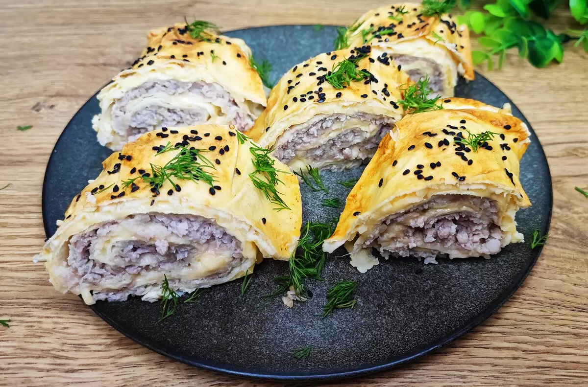 Приготовьте начинку. В глубокой миске тщательно перемешайте фарш с мелко нарезанным луком, добавьте соль и специи. Убедитесь, что масса стала однородной и хорошо пропиталась ароматами.Подготовьте остальные ингредиенты. Натрите сыр на крупной терке, а яйцо взбейте венчиком. Эти ингредиенты добавят рулету неповторимый вкус и аппетитный цвет при запекании.Соберите рулет. На первый лист лаваша равномерно распределите взбитое яйцо и посыпьте тертым сыром. Далее уложите второй лист, на него выложите начинку из фарша и аккуратно сверните рулет, не беспокоясь о возможных разрывах лаваша — после запекания он станет мягким и нежным.Подготовьте к запеканию. Поместите рулет в форму для запекания, смажьте верх взбитым яйцом и обильно посыпьте кунжутом — это сделает его не только вкусным, но и эстетически привлекательным.Запекайте. Отправьте рулет в разогретую до 180 °C духовку на 40-45 минут, при этом первые 25 минут лучше запекать под фольгой, чтобы он не подгорел.Подавайте. После выпекания дайте рулету немного остыть, нарежьте его на порционные кусочки и наслаждайтесь вместе с соусом из сметаны и зелени или лёгким овощным салатом.Этот рулет стал настоящим любимцем на столе: легкий в приготовлении, бюджетный и невероятно вкусный. Совершенно не требуя сложных кулинарных навыков, он займет достойное место в списке ваших семейных угощений. Попробуйте его приготовить, и впечатлите своих гостей блюдом, которое сложно забыть.