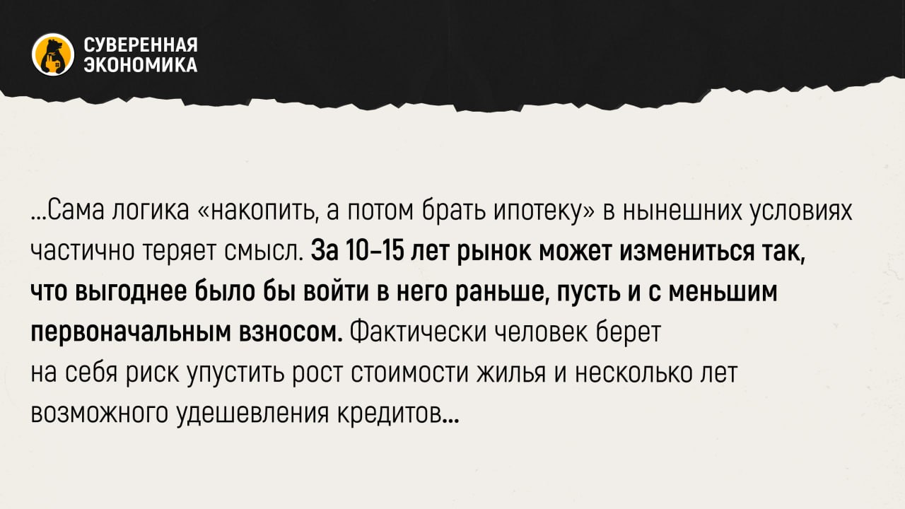 Вроде бы все складно, но есть нюанс. Сама логика «накопить, а потом брать ипотеку» в нынешних условиях частично теряет смысл. За 10–15 лет рынок может измениться так, что выгоднее было бы войти в него раньше, пусть и с меньшим первоначальным взносом. Фактически человек берет на себя риск упустить рост стоимости жилья и несколько лет возможного удешевления кредитов, в обмен на более комфортный старт. Поэтому такая стратегия не столько про покупку квартиры, сколько про осторожное поведение: сначала накопить подушку, а уже потом принимать решение, а не наоборот.