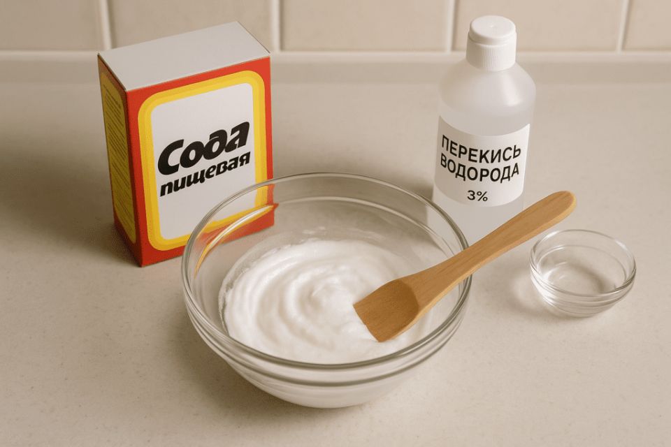 - Приготовление пасты: Смешайте равные части пищевой соды и крахмала, добавив немного воды.