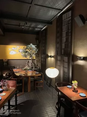 Интерьер ресторана выполнен в минималистичном стиле с использованием темного дерева и мрамора. Приглушенный свет, а также винтажные детали и фарфор из Японии создают атмосферу уюта и спокойствия. Каждый уголок заведения продуман до мелочей, что делает его идеальным местом для спокойного ужина или романтической встречи.