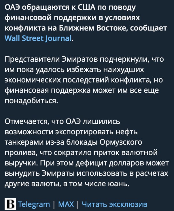 Вот, например, Эмираты прямо шантажируют гегемона: дайте грошей, иначе уйдем из доллара. Те самые Эмираты, которые год назад обещали наоборот, вложить в экономику США 1,4 трлн долларов.