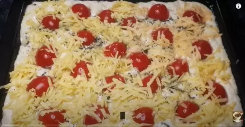 После завершения подготовки, сделайте в тесте небольшие углубления, в которые вдавите ароматное масло. Разложите сверху помидоры и посыпьте тертым сыром. Разогрейте духовку до 200-220 градусов и выпекайте фокаццу около 20 минут. Наслаждайтесь восхитительным ароматом, который заполнит дом, и приготовьтесь к тому, что этот хлеб не даст вам заскучать: съедается мгновенно и горячим!