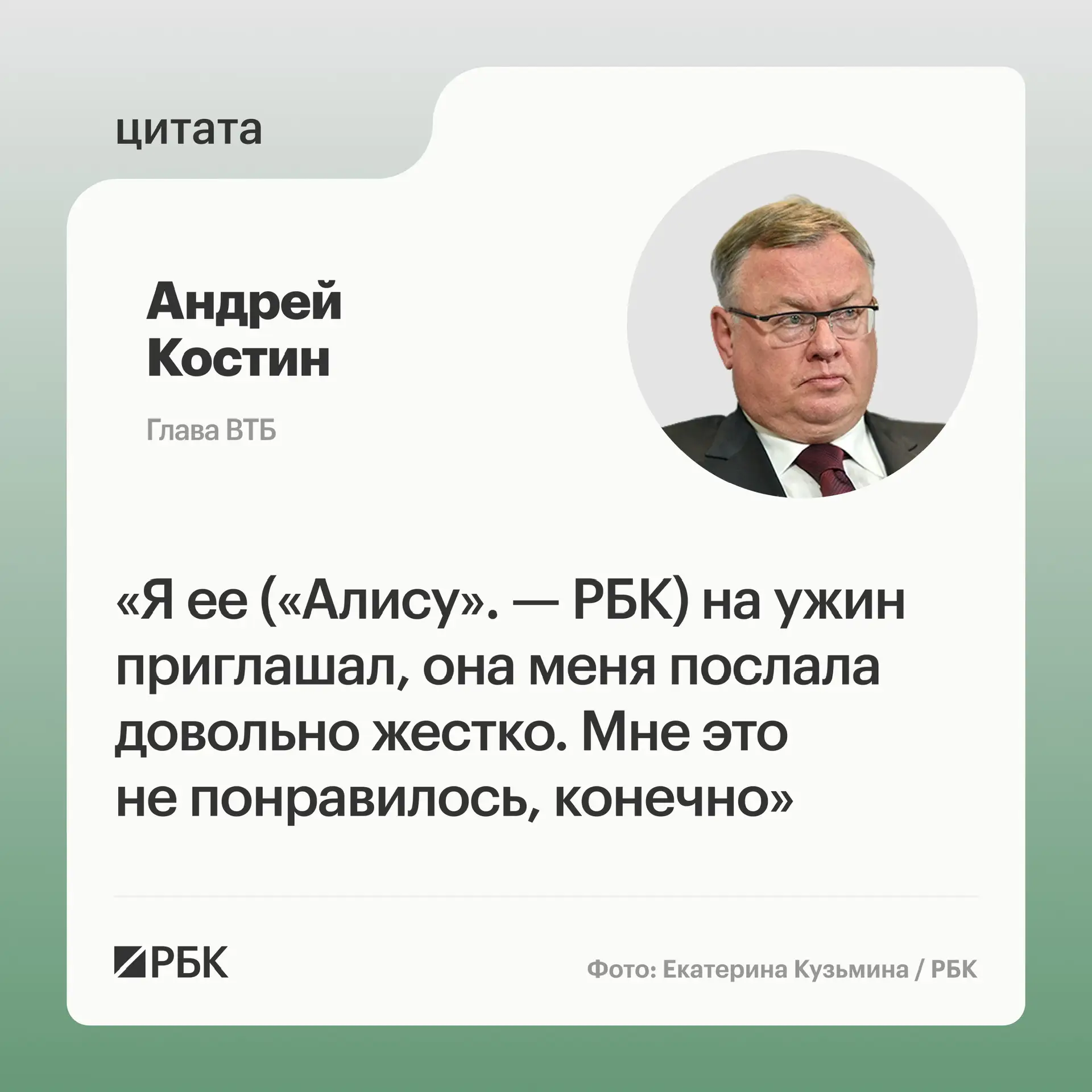 Глава ВТБ Андрей Костин рассказал, как пытался пригласить разработанного «Яндексом» голосового ассистента «Алиса» на ужин. Об этом он сообщил на встрече с крупнейшими клиентами банка.