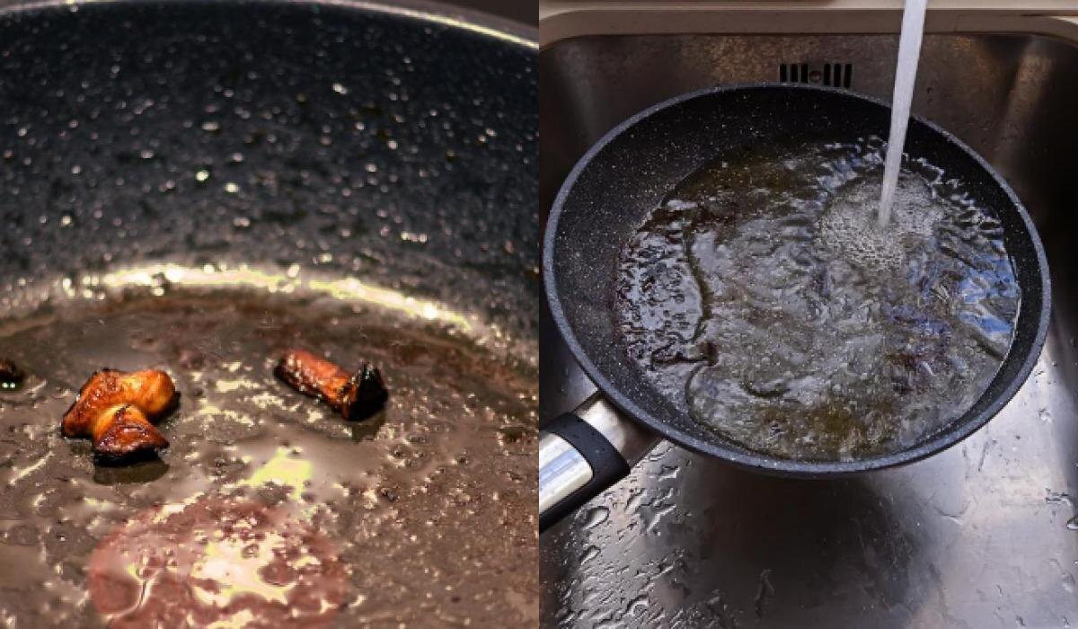 - Если на сковороде все еще остались жирные следы или остатки мяса, повторите процесс, добавив немного моющего средства сразу после выключения огня.